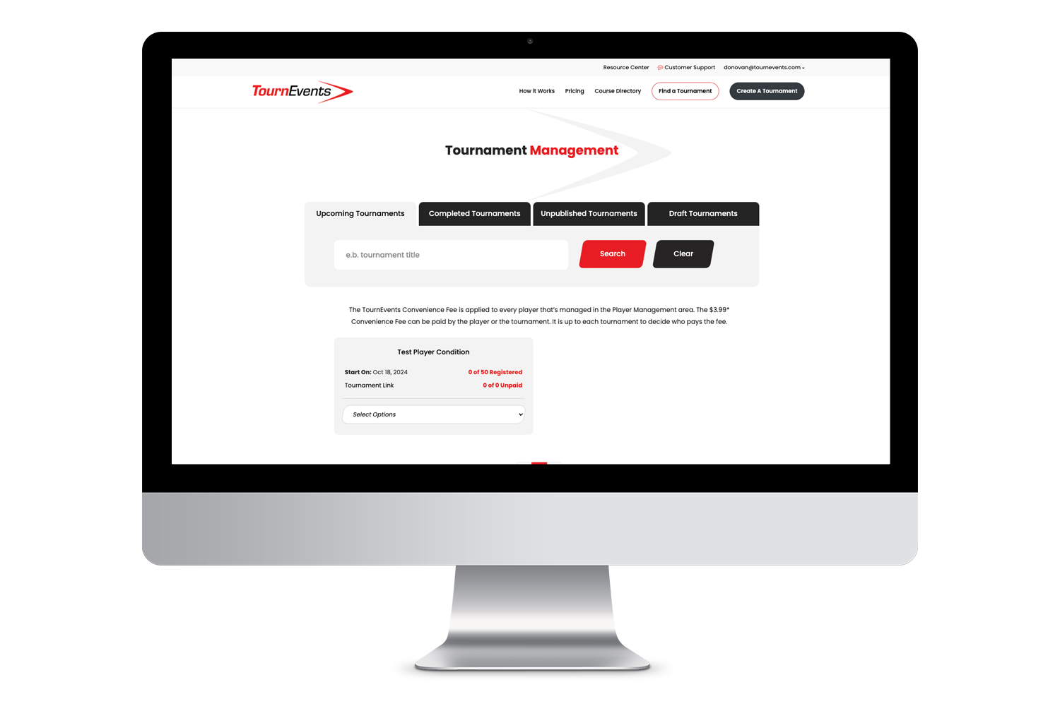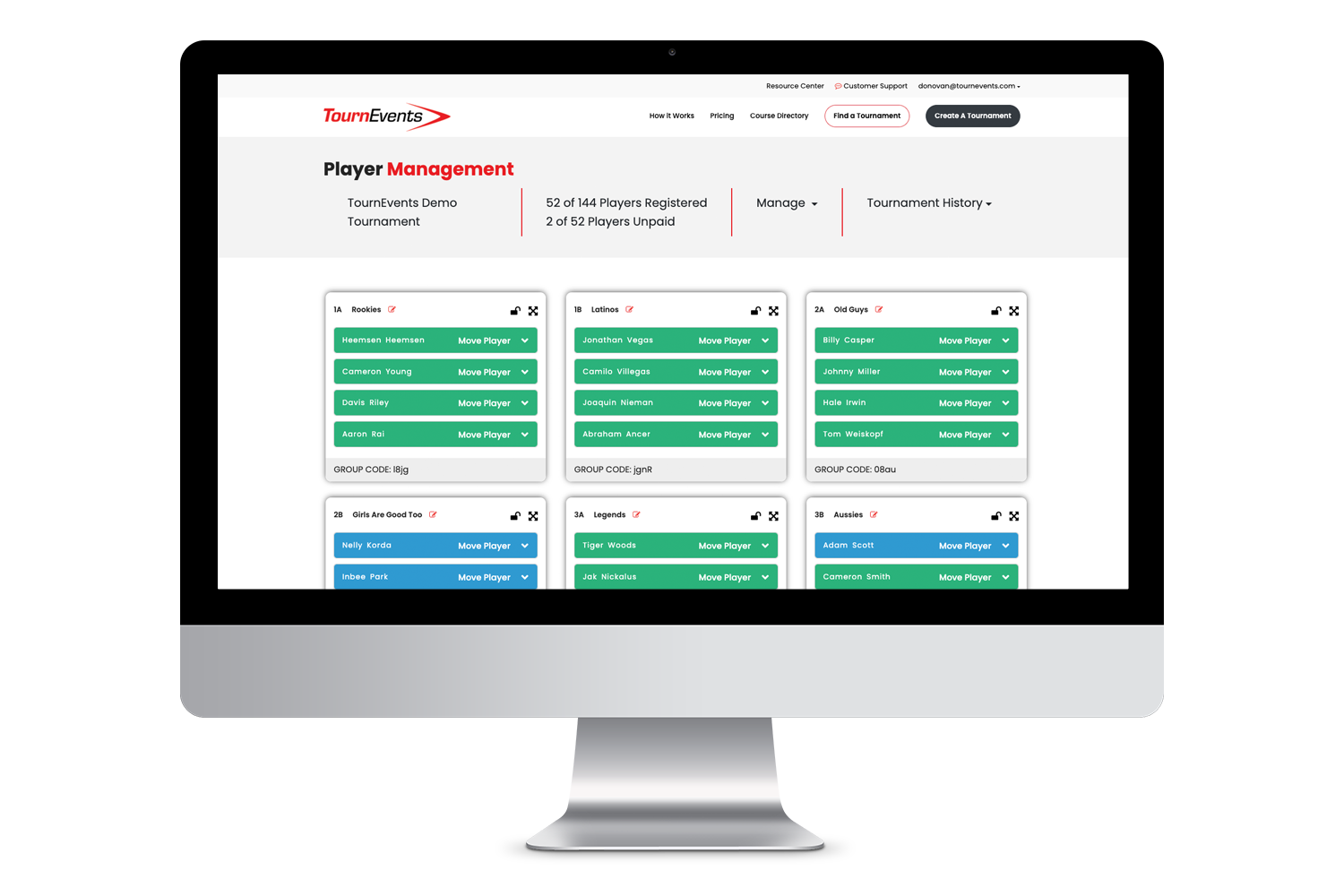 Use your Tournament Dashboard for everything -- view players, payments, groups, and send reminders. Manage the logistics and communications up to and on the day of the tournament.