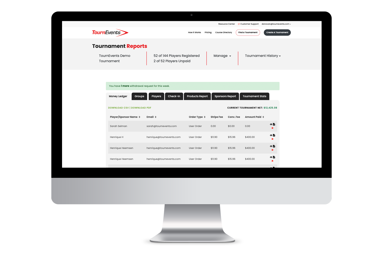 Keep track of all your purchases/players coming in with our real time reporting. Just login to your Tournament Management area and go to the Reports section of your tournament to view your Money Ledger, Groups, Players, Check-In Reports and more.